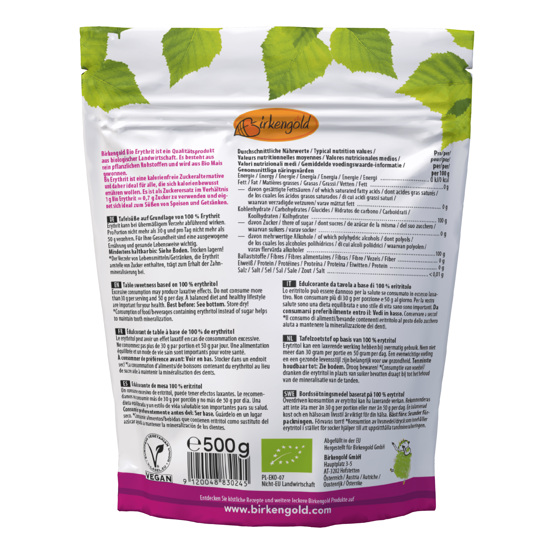Der Birkengold® Bio Erythrit Nachfüllbeutel ist mit 500 Gramm rein biologischem Erythrit ausgewählter Qualität gefüllt. Der Beutel ist wieder verschließbar, lässt sich gut aufstellen und das Bio Erythrit kann einfach herausgeleert werden. Die ideale Größe zum Backen, Marmeladen einkochen und für Desserts.