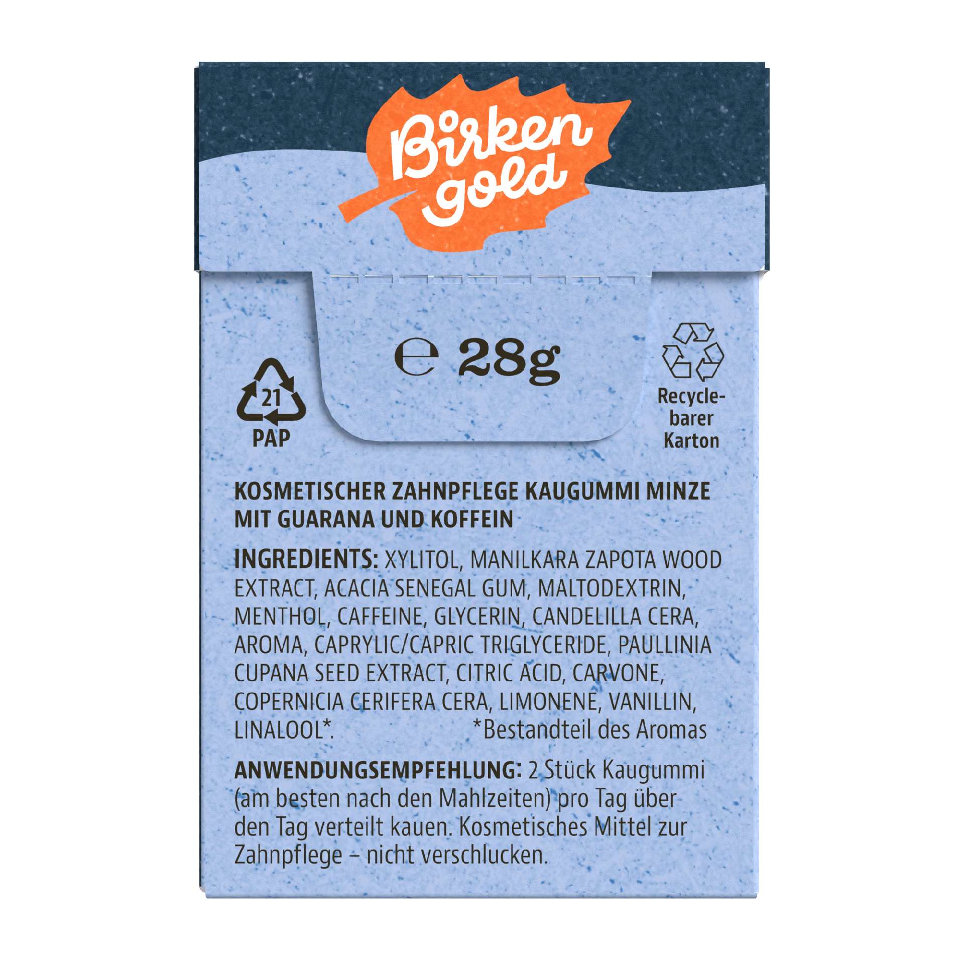 Erfrischender Minzgeschmack trifft auf die belebende Wirkung von Guarana und Koffein – ideal für den Moment, in dem du einen zusätzlichen Energieschub brauchst. Starte frisch und voller Energie in den Tag – mit unserem neuen Birkengold Energy Kaugummi.