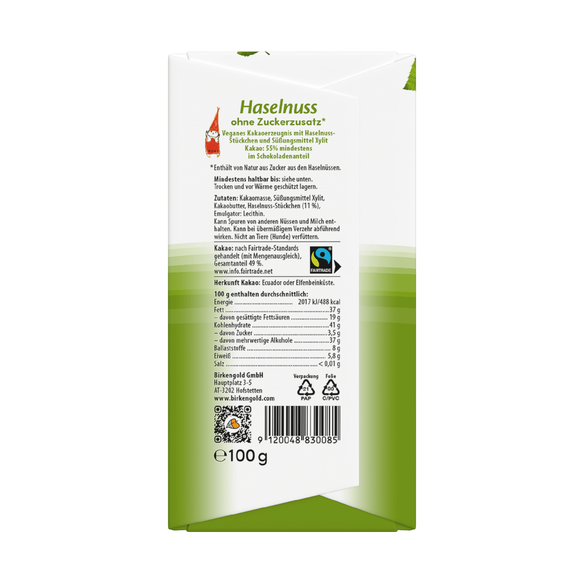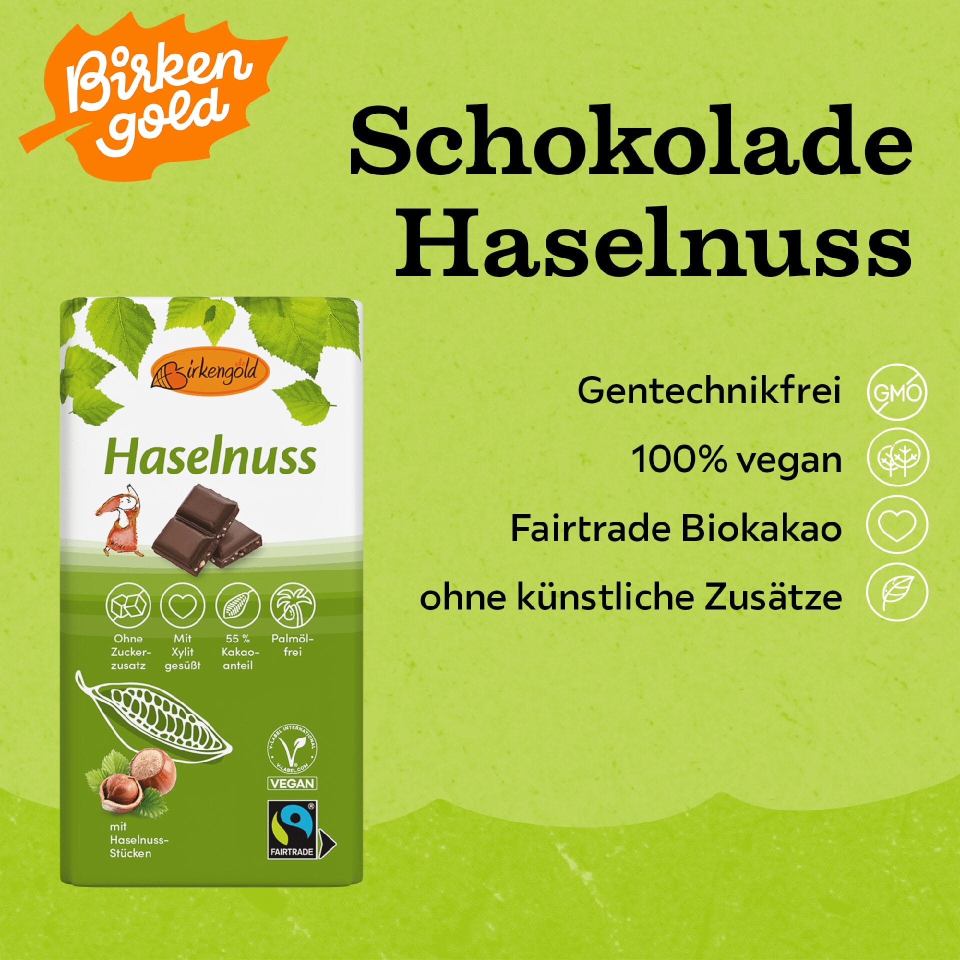 Birkengold® Haselnuss ist natürlich ohne Zuckerzusatz, hat einen Kakaoanteil von 55% im Schokoladenanteil und darf das Fairtrade Siegel tragen. Kakao und Haselnüsse sind hochwertige Bioprodukte, gesüßt ist die köstliche Schokolade nur mit unserem Birkengold® Xylit. Unser Schokolade eignet sich perfekt zum Verschenken – ob im Osternest oder als Muttertagsüberraschung.