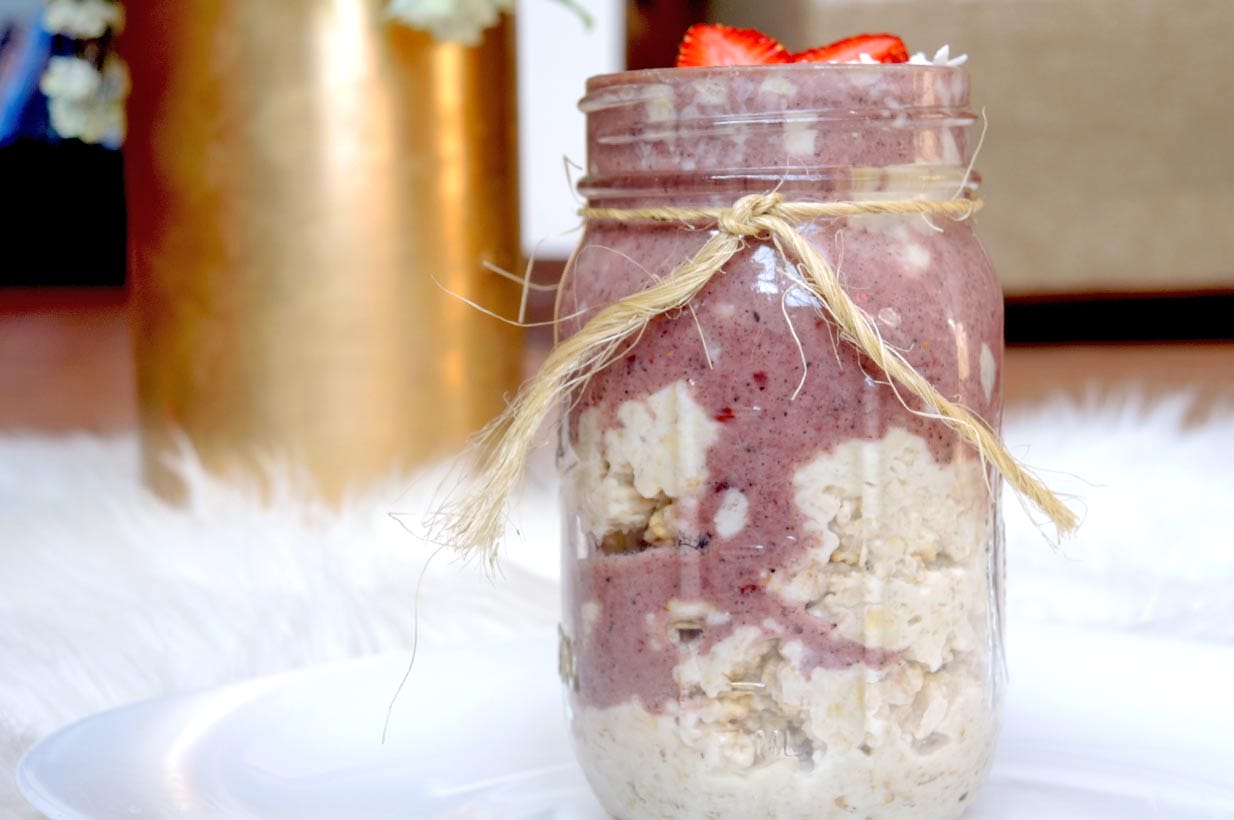 Für das Topping Kirschen, Erdbeeren, Acai Pulver und Mandelmilch pürieren und über die Haferflocken im Glas füllen. Wer mag, kann das Powerfrühstück noch mit Kokosflocken bestreuen.