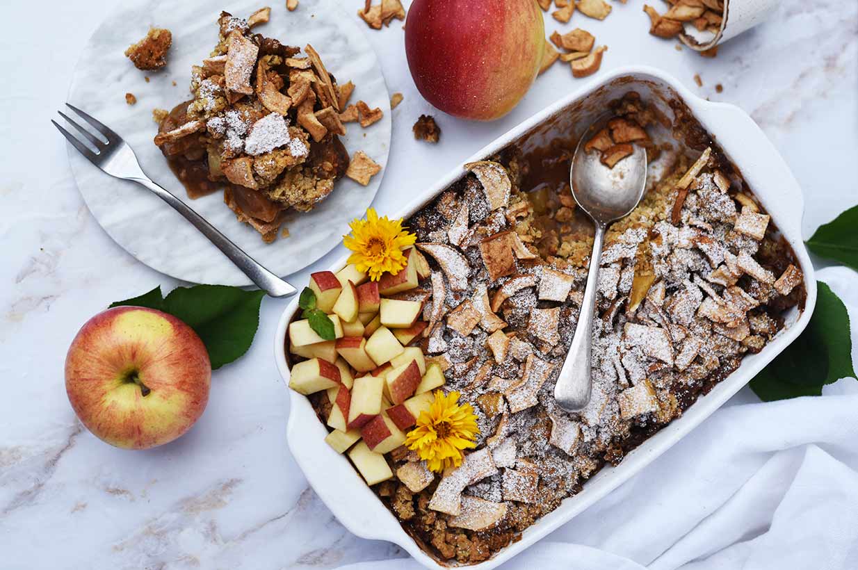 Der Apple Crumble ohne Zucker wird mit Dinkel und Hafer zubereitet.