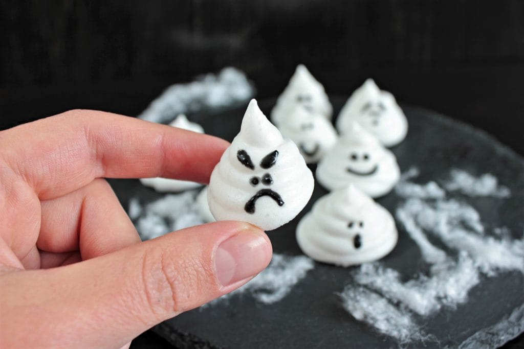 Nachdem das vegane Baiser vollständig getrocknet ist, können die Geister nach Lust und Laune mit gruseligen oder lustigen Gesichtern verziert werden. Besonders Kindern bereitet das Bemalen große Freude.