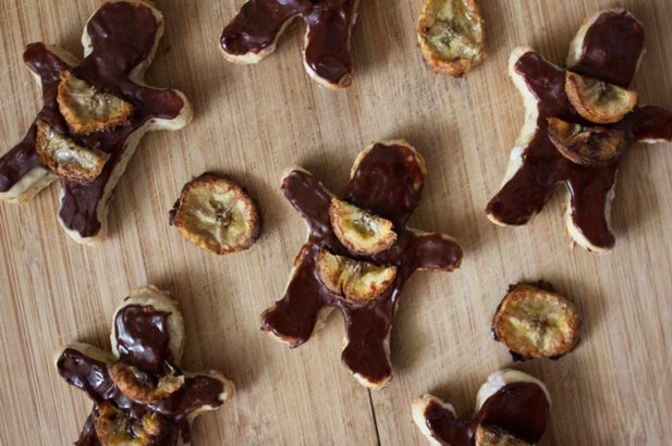 Die geschmolzene Schokolade auf die Bananenmänner streichen und mit den Bananenscheiben dekorieren.