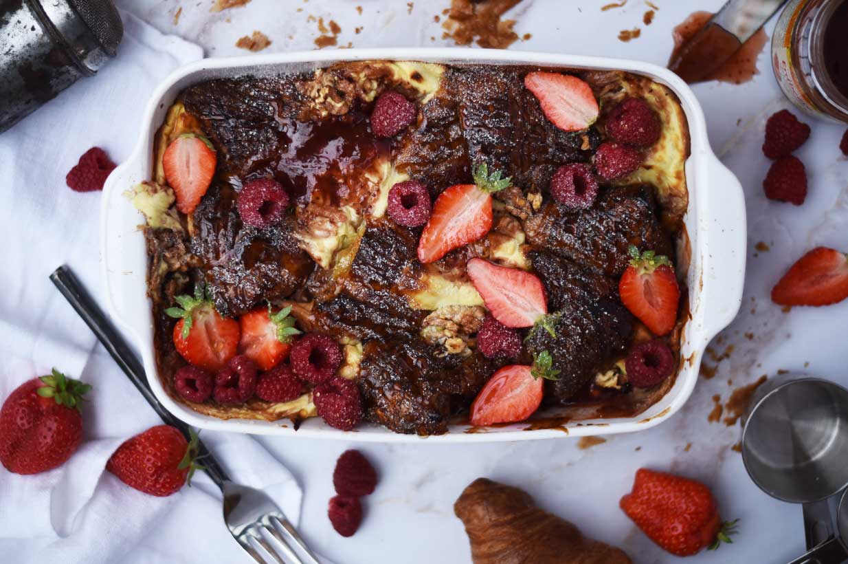 Probieren Sie diesen Croissant Auflauf auch mit frischen Früchten der Saison!