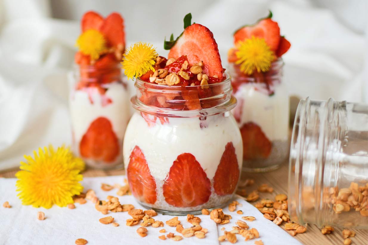 Nun die Chiamischung auf die drei Gläser aufteilen und das gesüßte Joghurt darüber leeren.