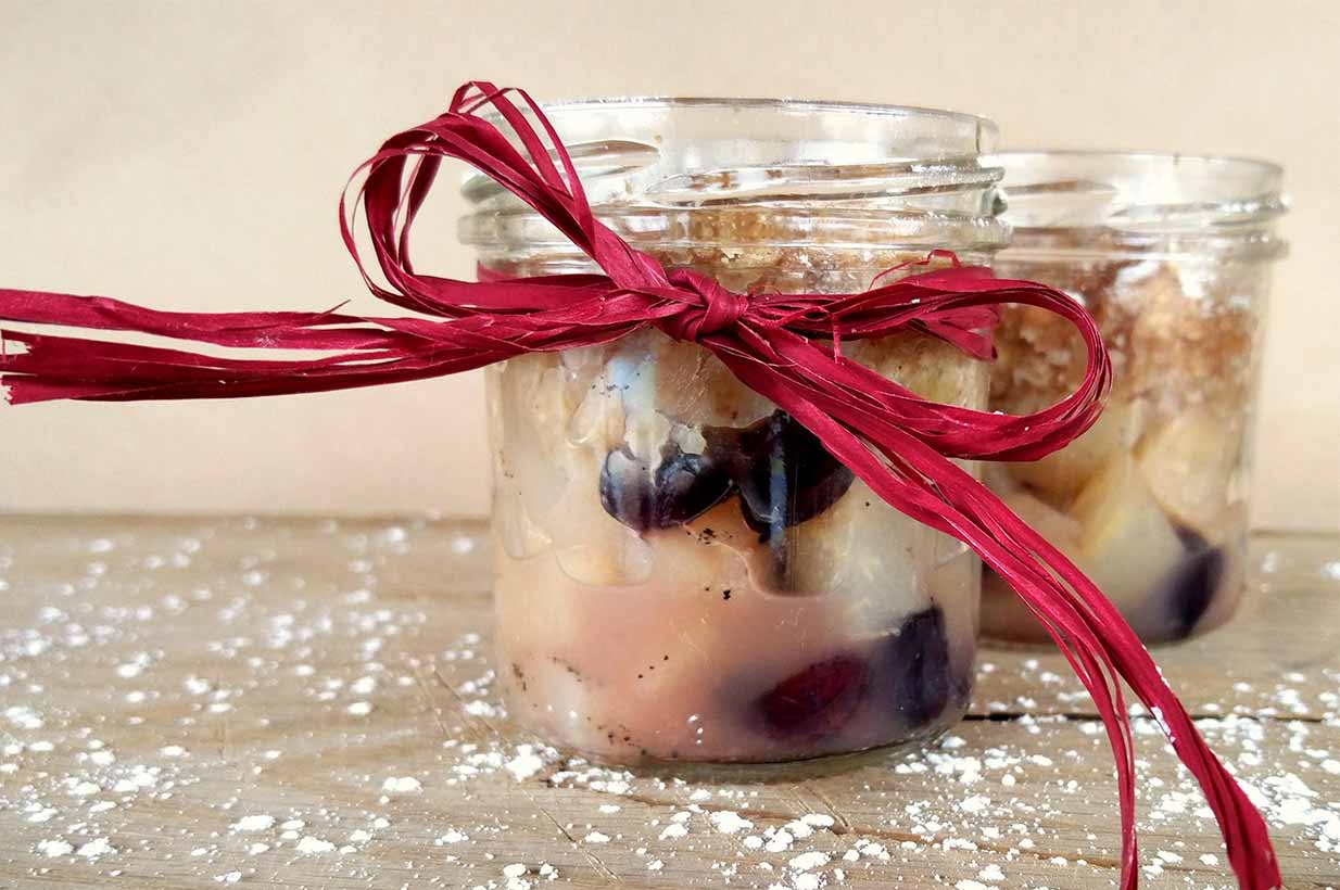 Das Birnen Cranberry-Kompott wird jetzt gleichmäßig in 5 Gläser gefüllt, die Teigkrümmel werden darauf gestreut.