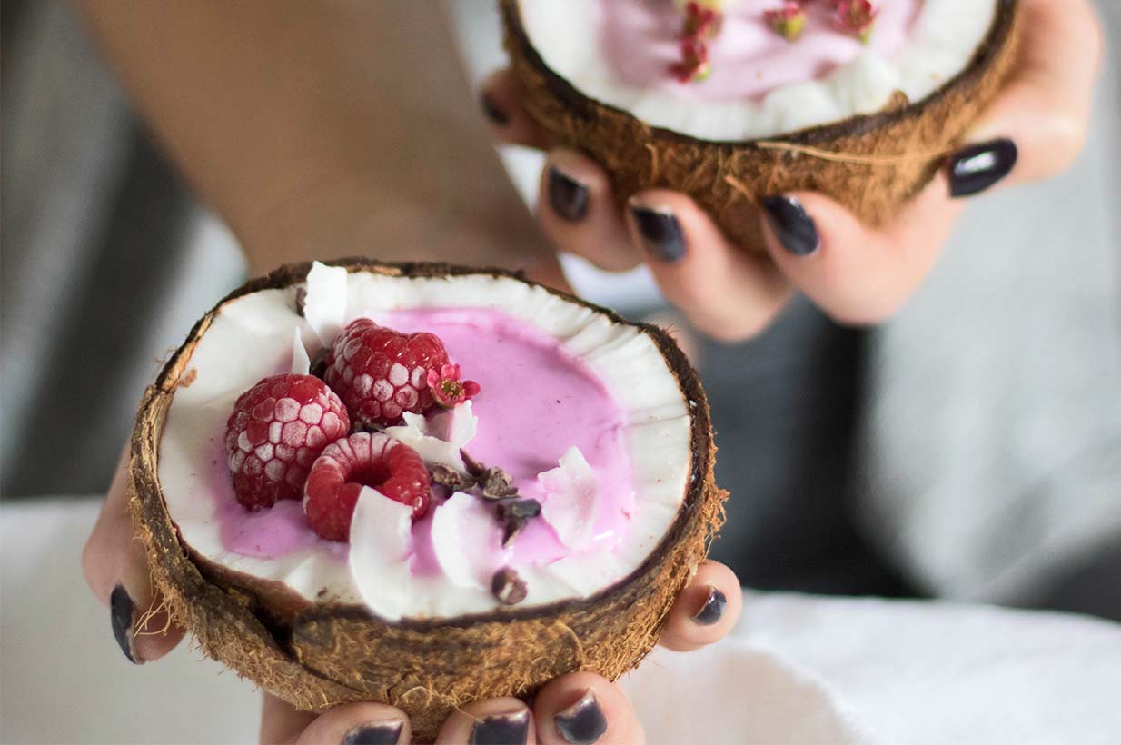 Dieses gesunde Dessert oder Frühstück ist ein wahrer Hingucker - eine bunte Kokosnuss mit locker leichter Füllung!