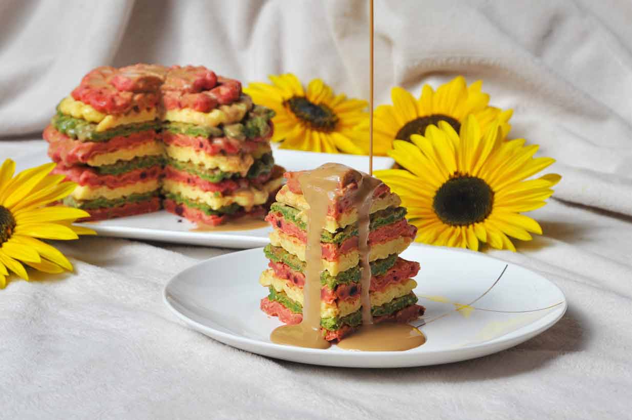 Nun in einem Waffeleisen die Waffeln nacheinander herausbacken und zu einem bunten Turm schichten.