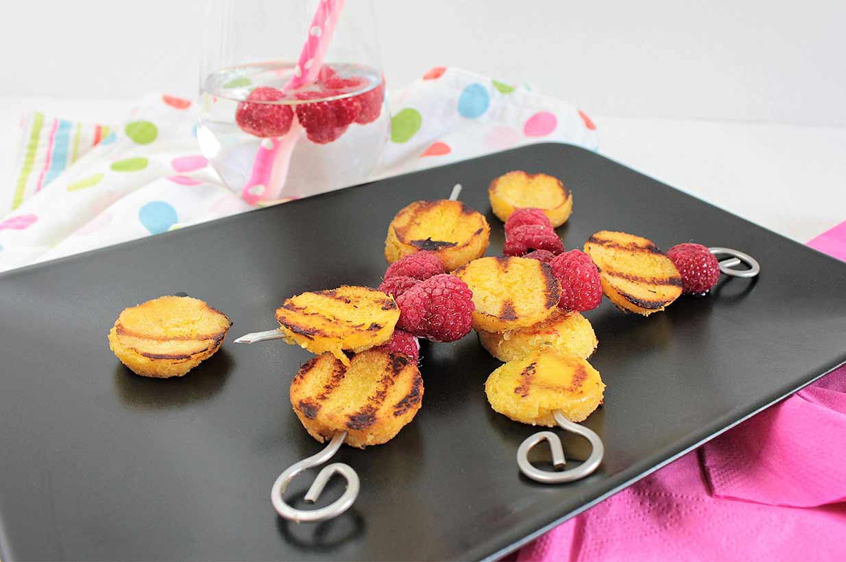 Zum Grillen einfach nach Belieben mehrere, gut durchgekühlte Kuchenstücke mit Früchten auf geeignete Spieße stecken. Dabei darauf achten, dass die Früchte gleich hoch wie die Kuchenstücken sind, da der Cheesecake sonst beim Grillen keine Farbe bekommt.