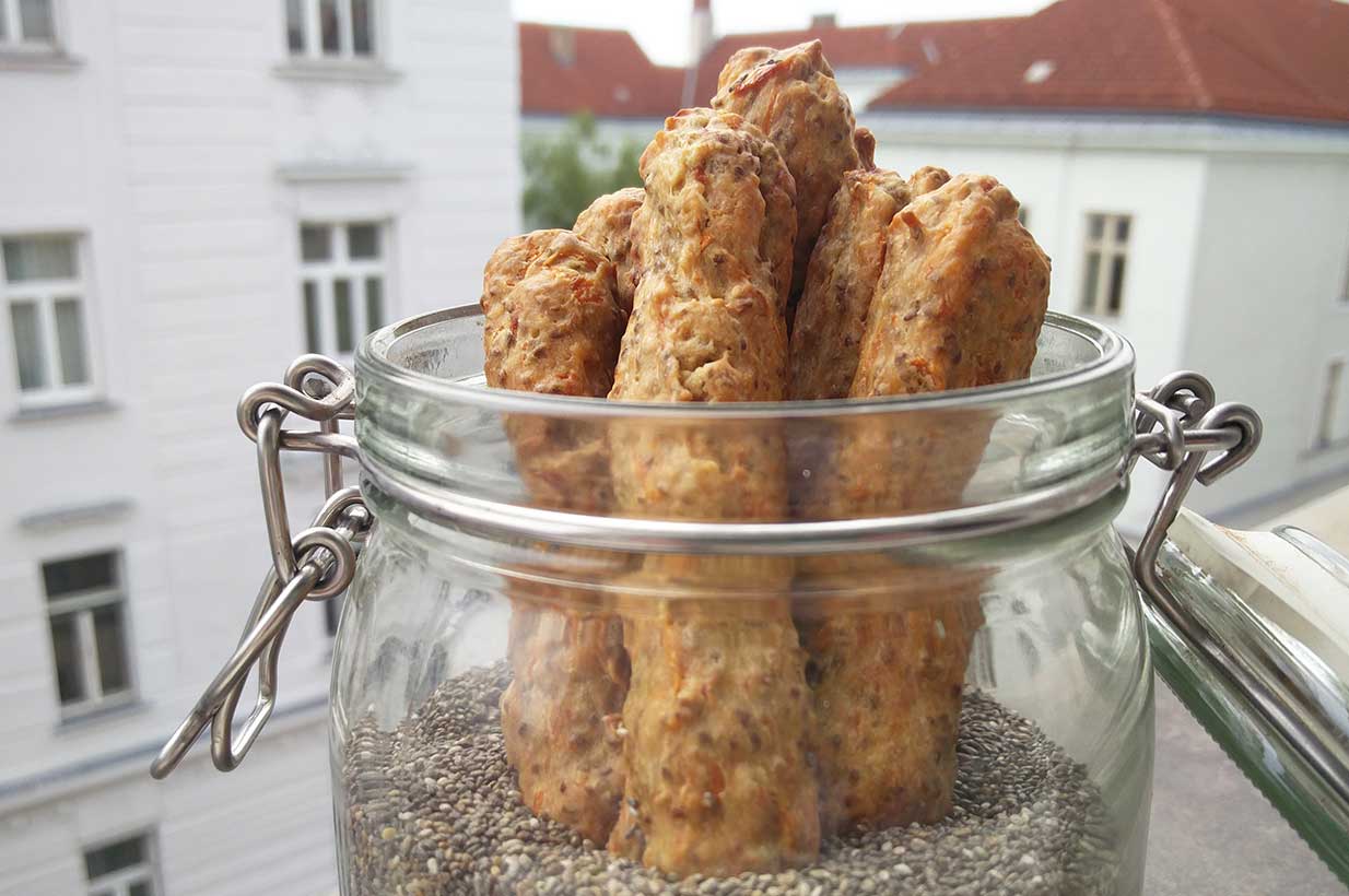 Da die Chia-Dinkelstangen eher weich sind, eignen sie sich bestens zum Knabbern für Kleinkinder und zum Lutschen und Spielen für Babys ab dem 6. Monat. Gegebenenfalls die Stangen einfrieren, da sie sich aufgrund der Banane nicht allzu lange haltbar sind.