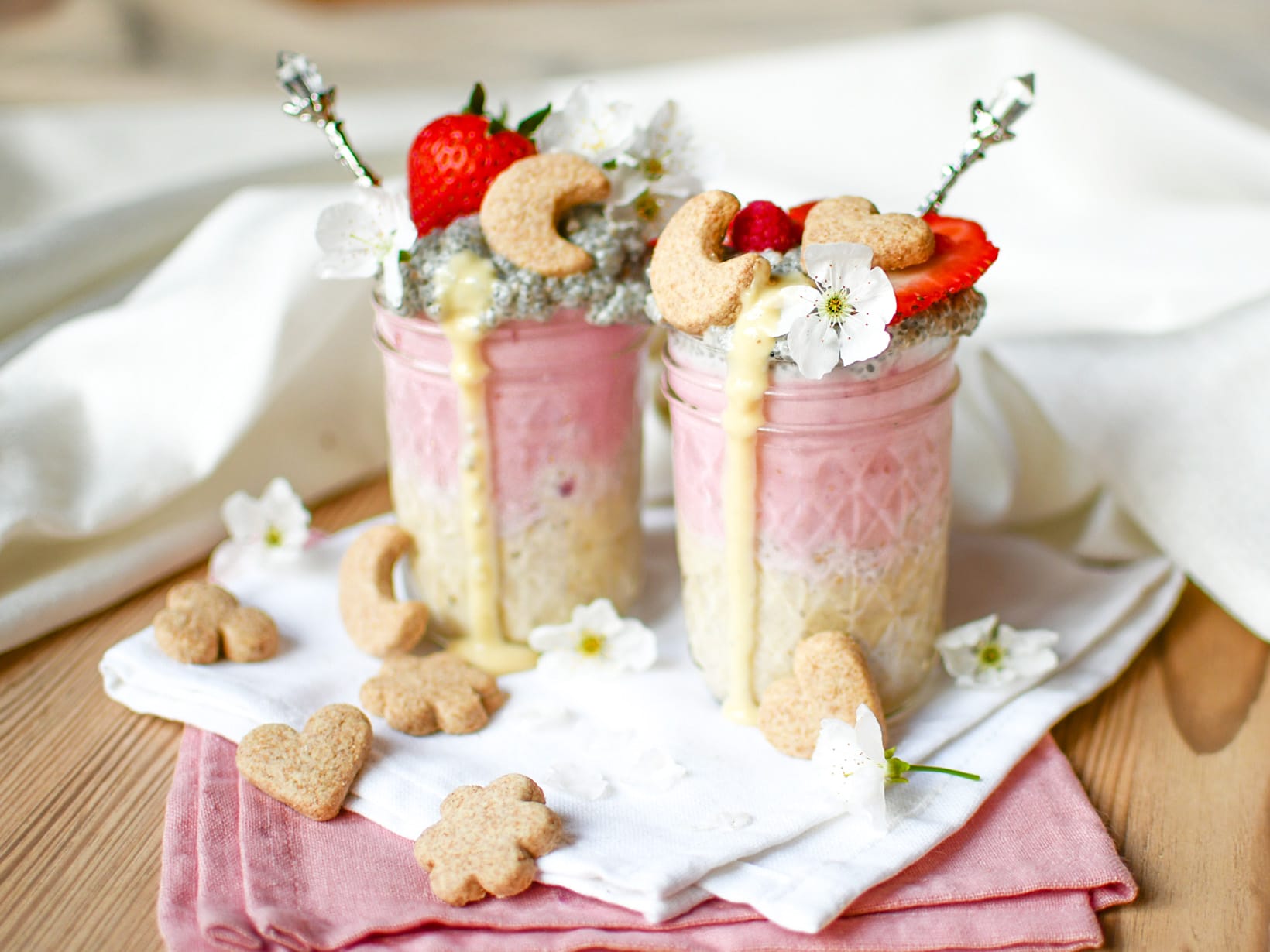Zuletzt mit Erdbeeren, Blüten (optional), Mandelbutter und Birkengold Dinkel-Vollkorn-Kekse dekorieren.