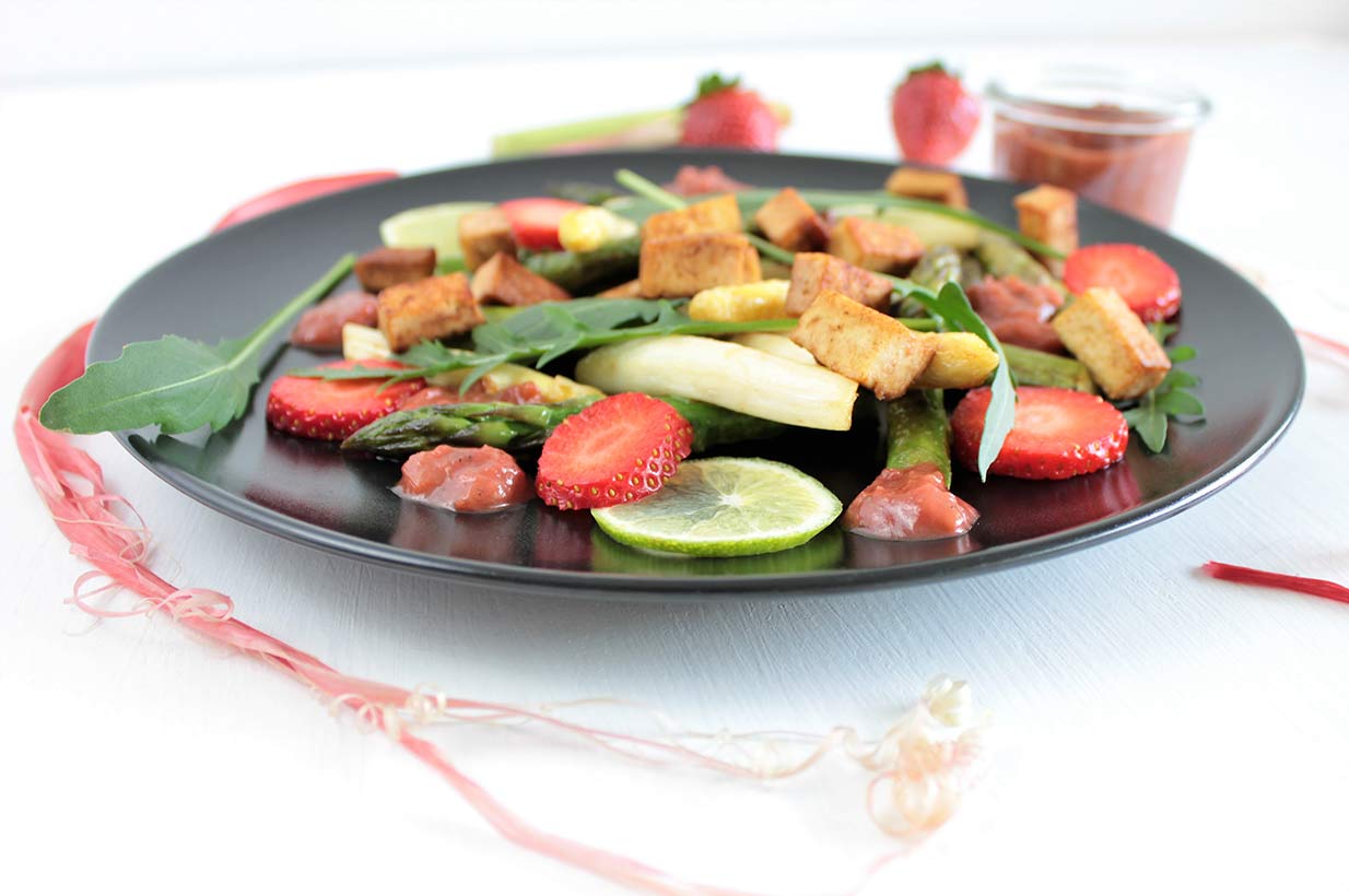 Besonders zu Spargel passen pikante Saucen mit einer süßen Note sehr gut. Dieses Erdbeer-Rhabarber-Chutney mit gebratenem Spargel ist ein leckeres Rezept für einen lauwarmen Beilagensalat zu gegrillten Speisen oder als leichtes Mittagessen. Dazu passt hervorragend knusprig gebratener Tofu und warmes, frisches Brot oder Couscous sowie Quinoa.