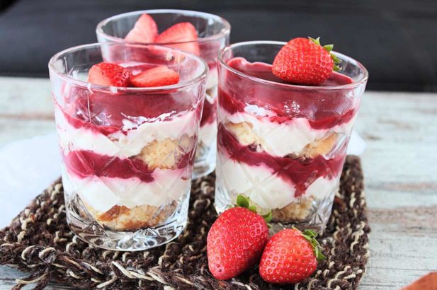 Klassisches Erdbeer Tiramisu zuckerfrei und im Glas serviert.