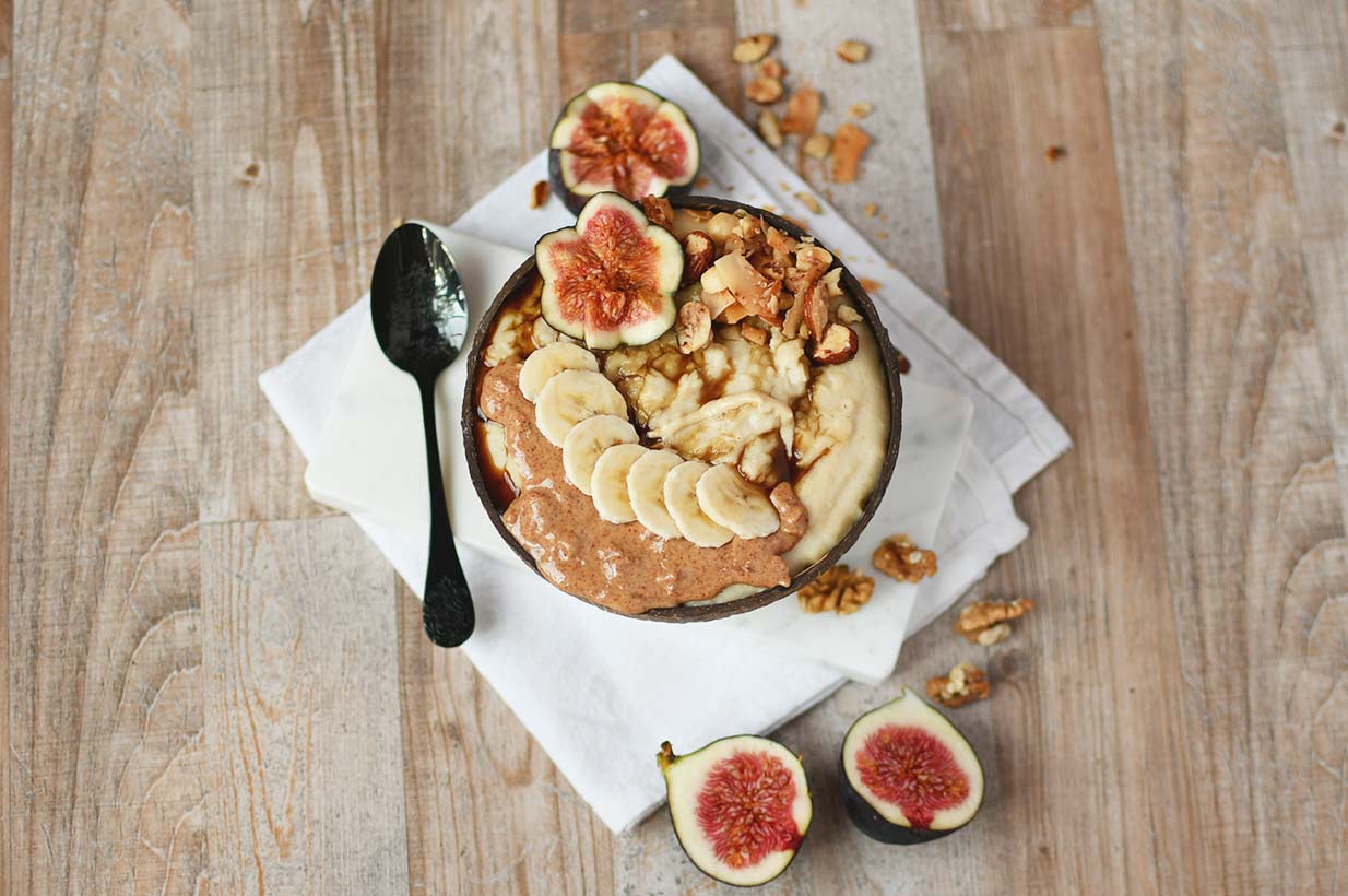 Zum Schluss das Erdnussmus über das Porridge geben und mit Granola, Maple Sirup, Feigen und Nüssen verzieren.