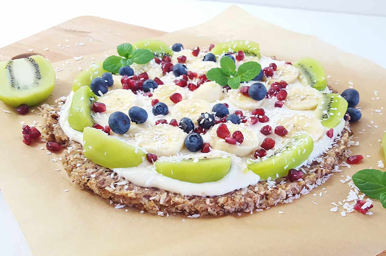 Sobald der Müsliboden etwas abgekühlt ist, mit dem Sojajoghurt bestreichen und mit Früchten nach Belieben belegen. Zum Abschluss mit frischer Minze und Kokosflocken verzieren.