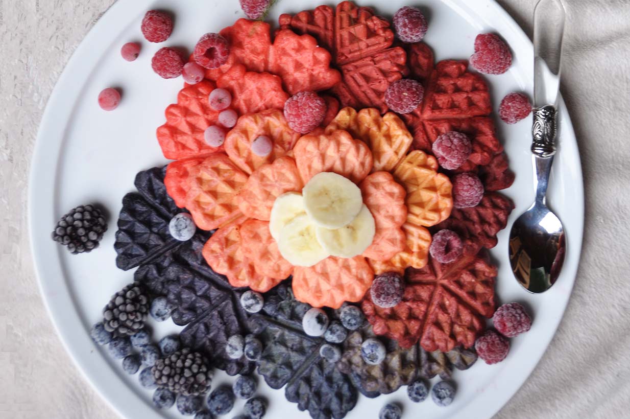 Gesunde Waffeln in bunten Farben können den Morgen zauberhaft werden lassen.