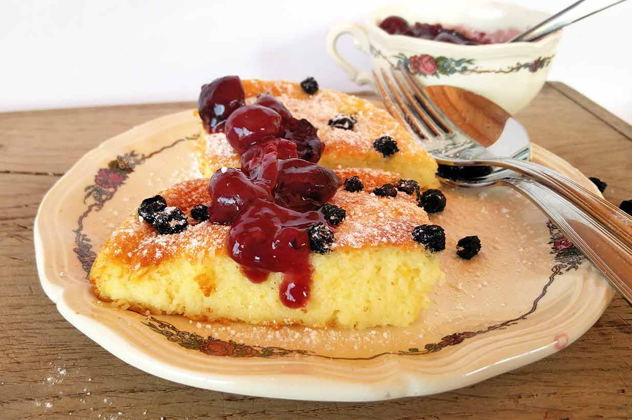 Tipp: Nicht nur Kirschkompott passt gut zu dieser Süßspeise. Wie wär's denn zum Beispiel mal mit einem Erdbeer-Rhabarber-Kompott dazu?