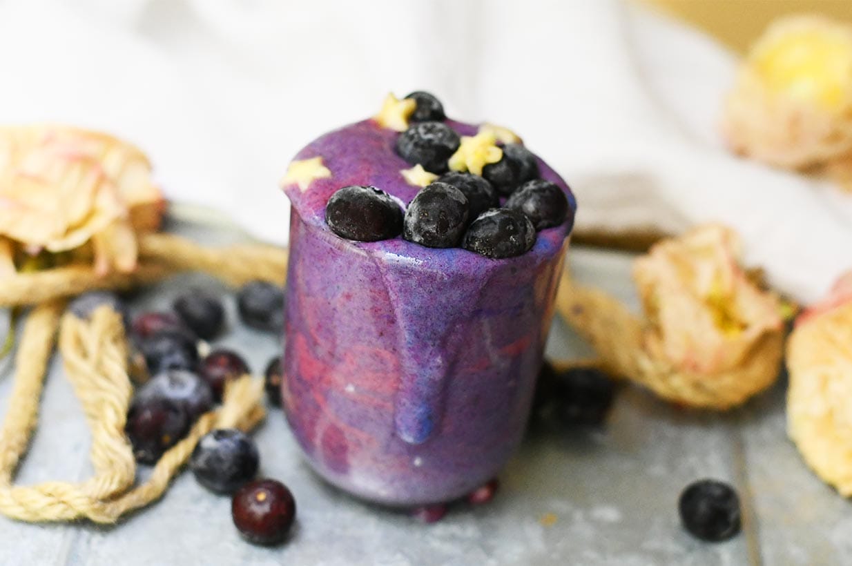 Dieser Heidelbeer Bananen Smoothie eignet sich besonders gut als schnelles Frühstück oder für den kleinen Hunger zwischendurch.