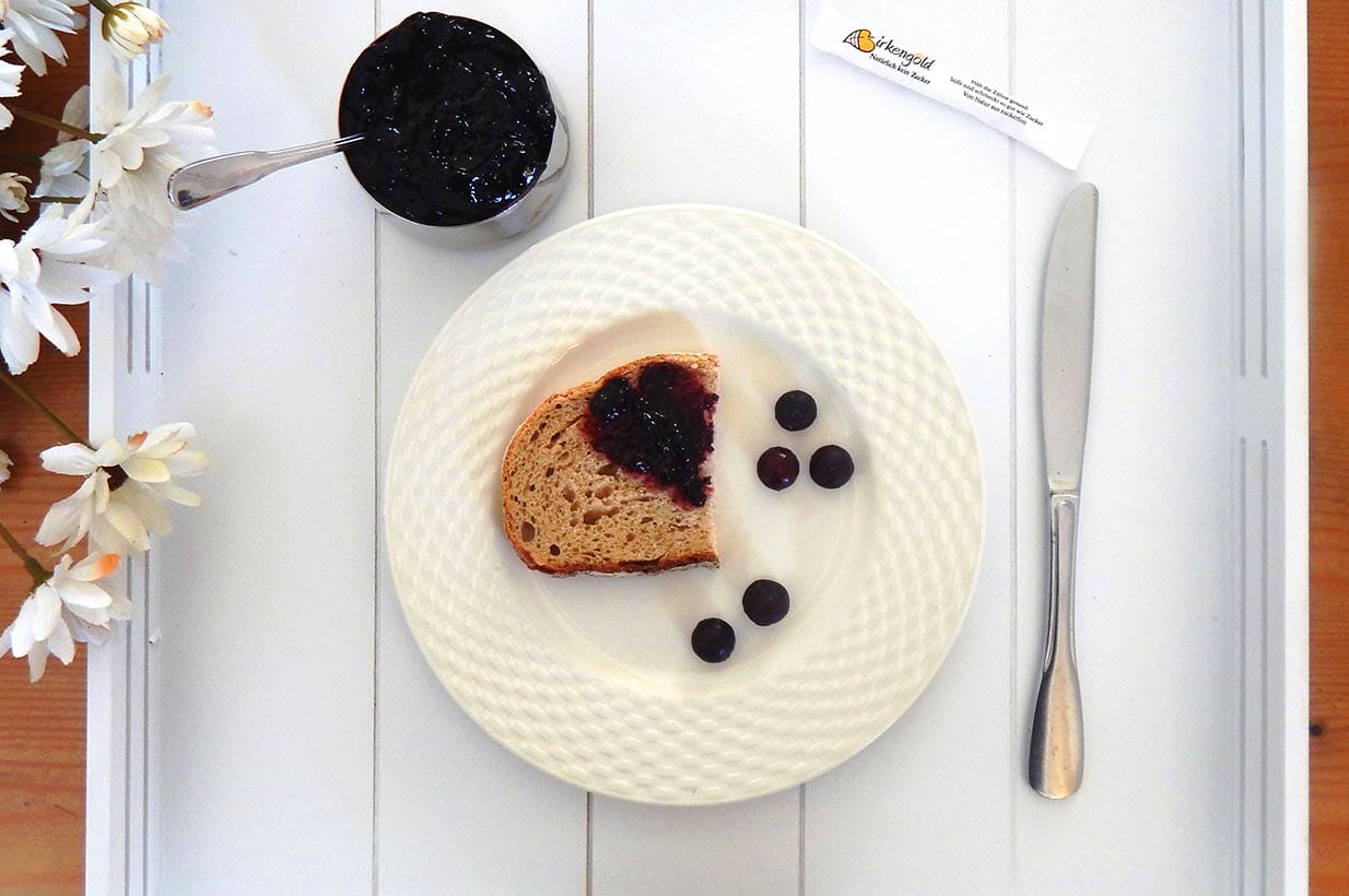 Die Heidelbeer Vanille Marmelade bekommt durch die Chia Samen ihre geleeartige Konsistenz - wenn Sie mal keinen Gelier-Birkenzucker zu Hause haben!