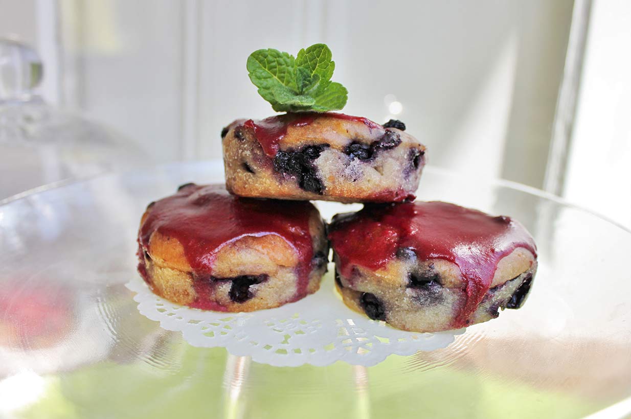 Den Guss nun auf den Muffins verteilen, mit Heidelbeeren und Minzeblättern garnieren und trocknen lassen.