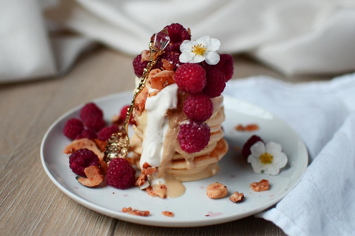 Diese Himbeer Mandel Pfannkuchen bringen eine köstliche Abwechslung auf den Frühstückstisch.