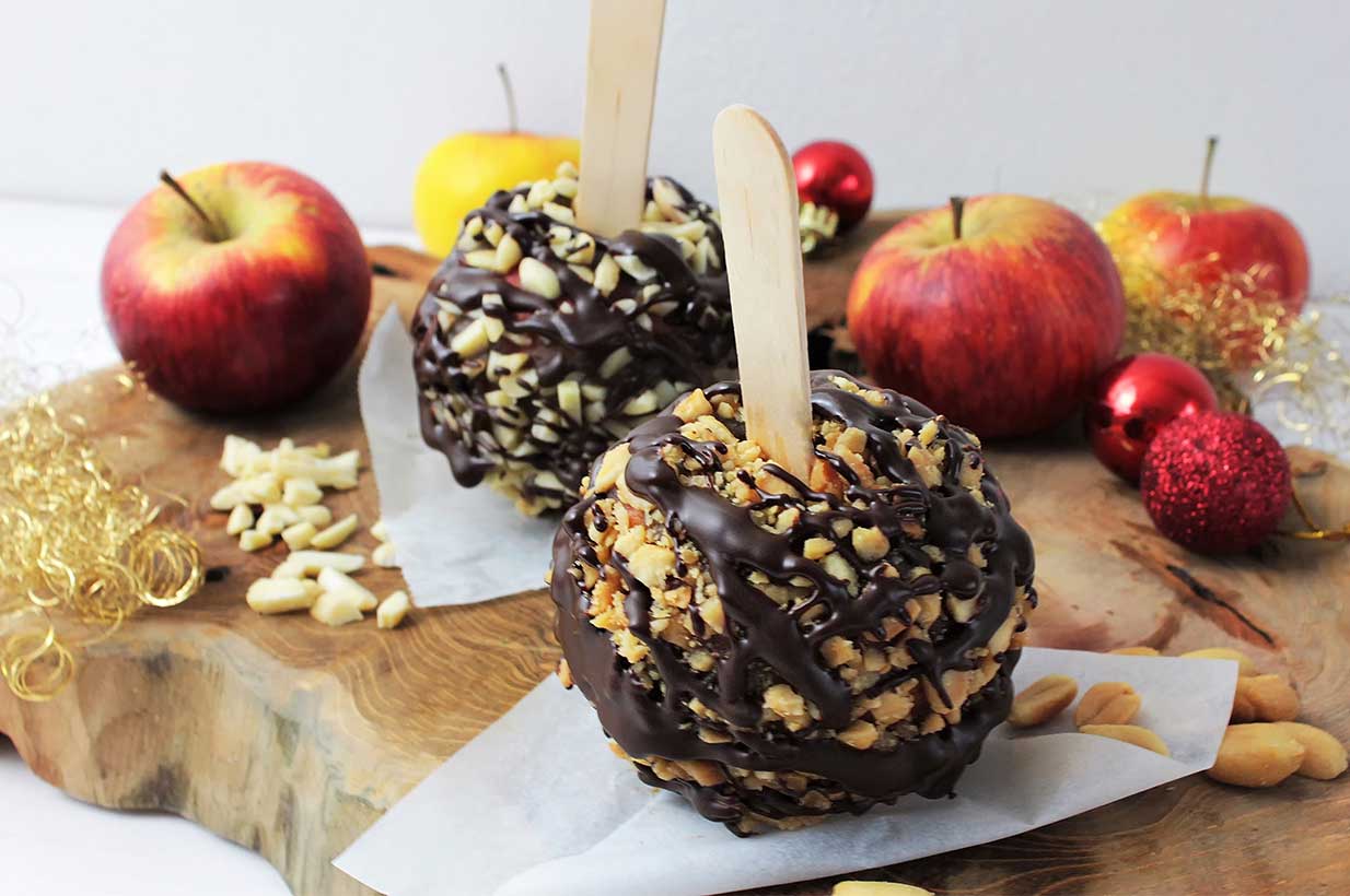 Karamelläpfel sind eigentlich echte Kalorienbomben, aber dieses Rezept mit Datteln, Nüssen und zuckerfreier Birkengold® Zartbitterschokolade ist ein vollwertiger Snack mit gesunden Zutaten für die Weihnachtszeit!