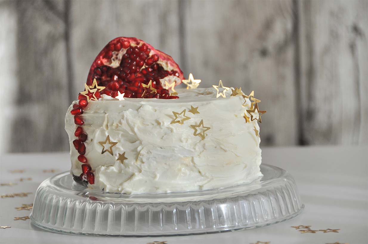 Danach Frischkäse in einer kleinen Schüssel mit der Zitronenschale und dem Birkengold Xylit mischen, die Oberfläche des Kuchen deckend einstreichen und dann nach Lust und Laune dekorieren. Wie wäre es zum Beispiel mit frischen Granatapfelkernen?