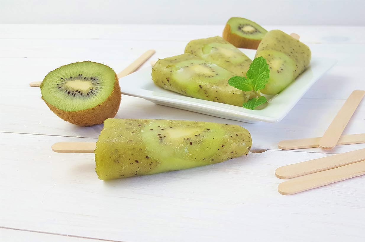 - Für 6 Stück Kiwieis am Stiel 6 - 7 Kiwis schälen, in grobe Stücke schneiden und in einem Mixer mit dem Saft einer halben Limette sowie Birkengold® Xylit fein pürieren. Sollte man gerade keine Limetten bekommen, kann natürlich auch Zitronensaft verwendet werden. Limettensaft passt allerdings sehr gut, um den Geschmack der Kiwis hervorzuheben.