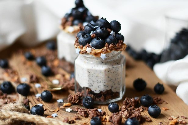 Als Nächstes den Glasrand mit (Erd-)nussbutter bestreichen und Heidelbeeren darauf platzieren.
