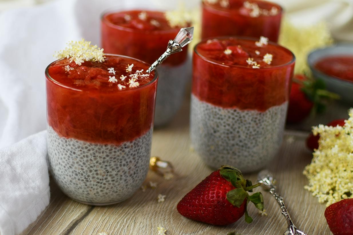 Jetzt das Erdbeer Rhabarber Kompott über die Chia Masse füllen und schön anrichten.
