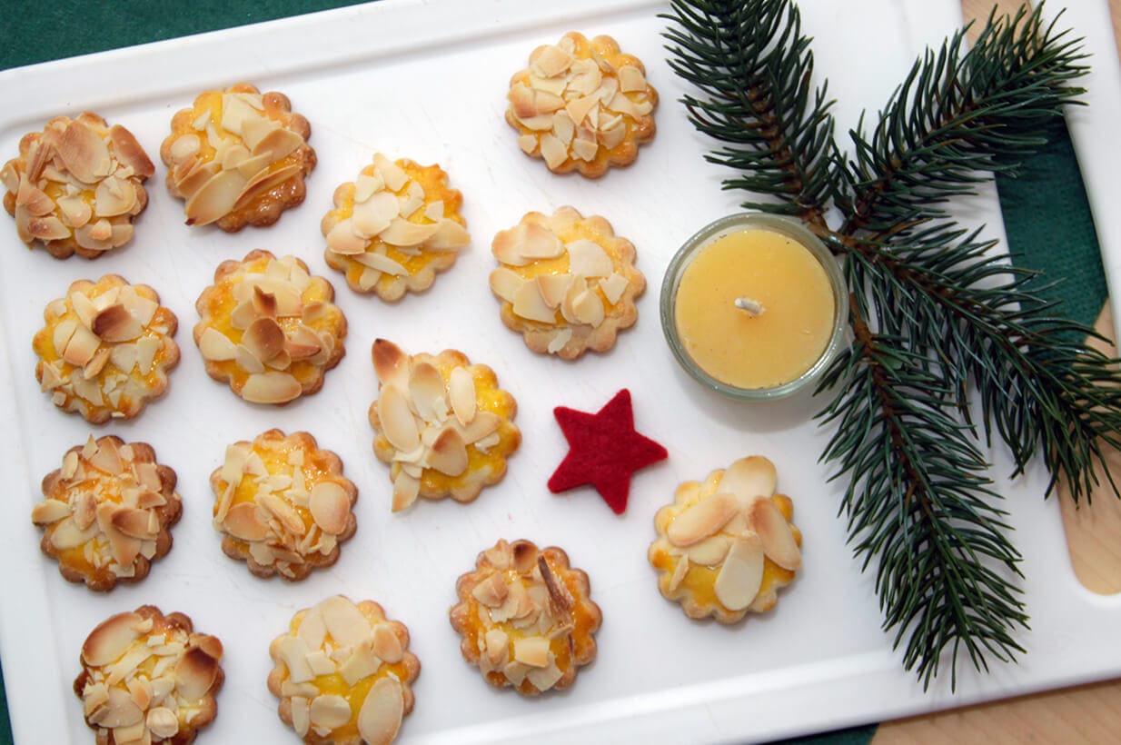 Zum Schluss noch mit Eidotter bestreichen und mit Mandelsplitter bestreuen.