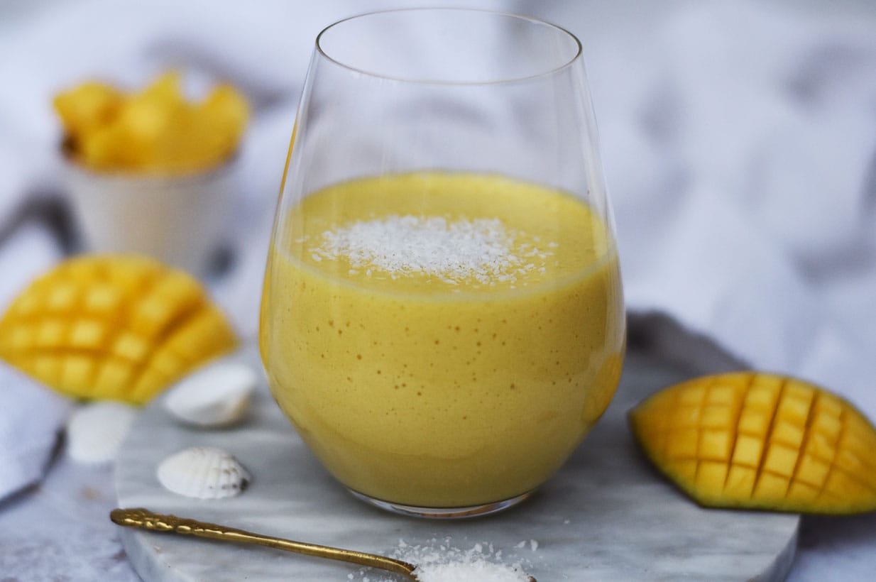 Das Mango Lassi kann mit Kokosjoghurt und Kokos Drink auch vegan zubereitet werden!