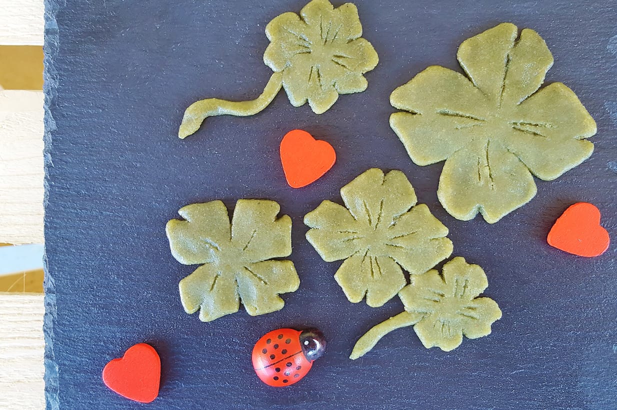 Entweder einen Kleeausstecher verwenden oder mit einem scharfen Messer gleichmäßige Quadrate zurechtschneiden. Wie auf dem Foto zu sehen ist, jeweils an den Längen und an den Ecken kleine, längliche Rechtecke auschneiden und die Kleeblätter mit den Fingern zurechtformen. Mit etwas Übung entstehen schnell schön geformte Blätter. Das Messer zwischendurch immer wieder mit einem feuchten Tuch säubern.