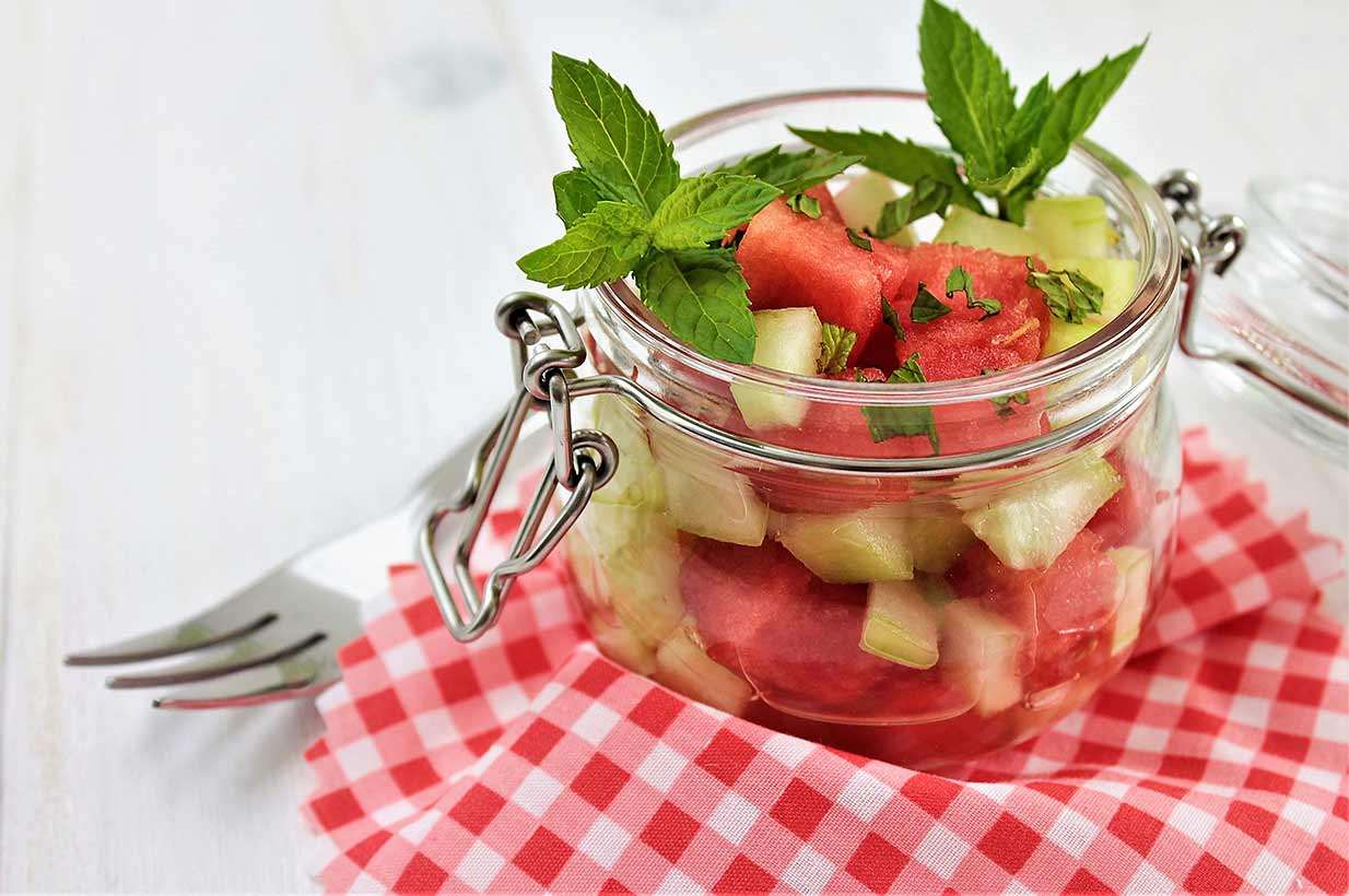 Nun das Dressing auf die Gläser mit der geschnittenen Melone sowie Gurke verteilen, Minze daraufgeben und verschließen. Kühl stellen oder in den Picknickkorb packen. Kurz vor dem Genießen das Glas kurz umdrehen, damit sich das Dressing verteilen kann.