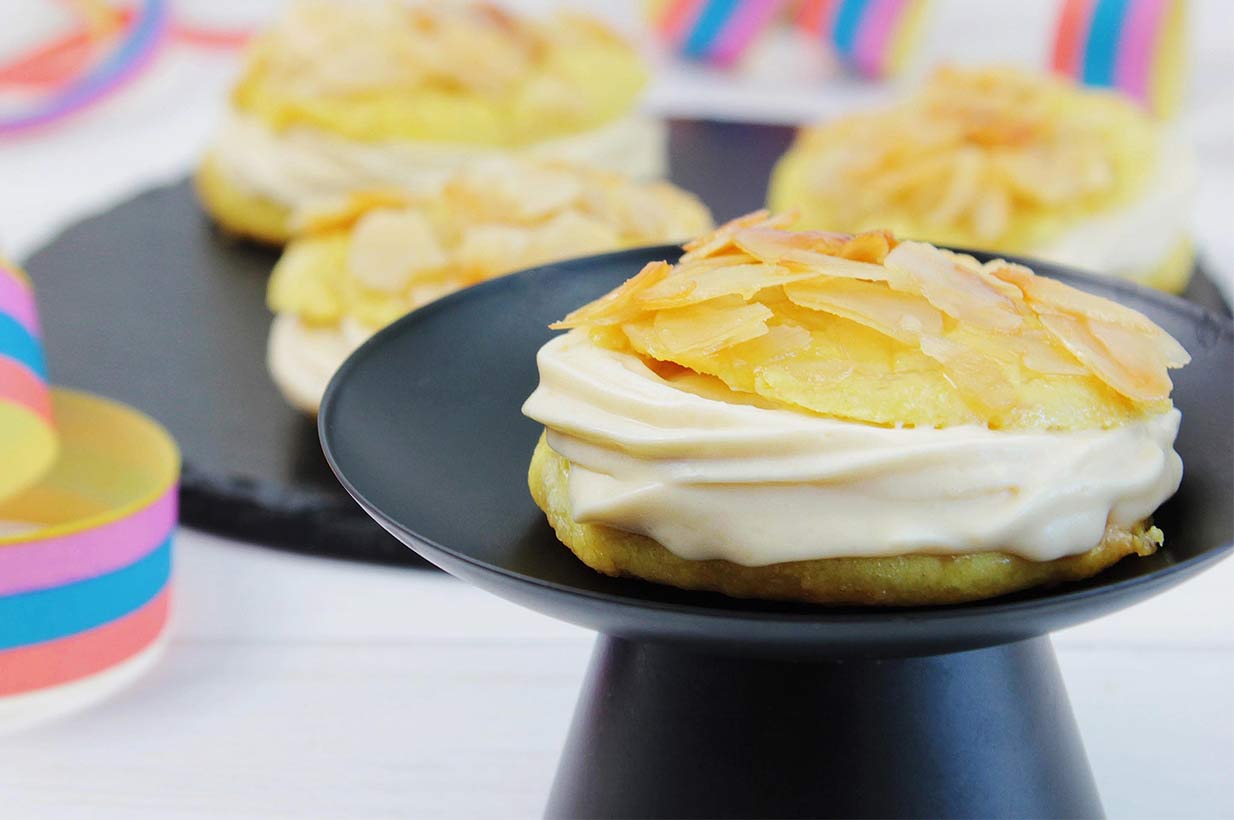 Dieses Rezept für Mini Bienenstich ist eine vegane Fingerfoodvariante zum traditionellen Hefeteigkuchen*. Die fluffigen Küchlein werden auf der Oberseite durch eine einen Belag aus einer karamellisierten Mandelmasse verfeinert und mit einer leichten Puddingcreme gefüllt.