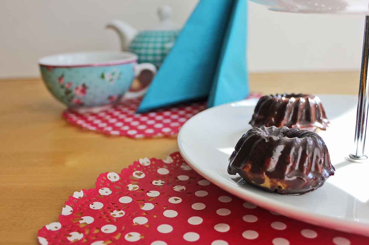 Glasur etwas auskühlen lassen und die Mini-Marmorkuchen damit überziehen.