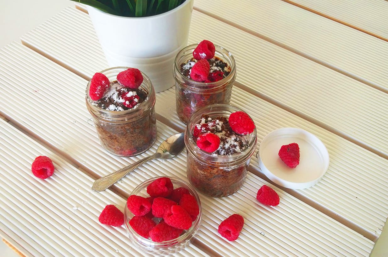 Diesen Mohnkuchen im Glas mit Himbeeren kann man überall hin mitnehmen und genießen.