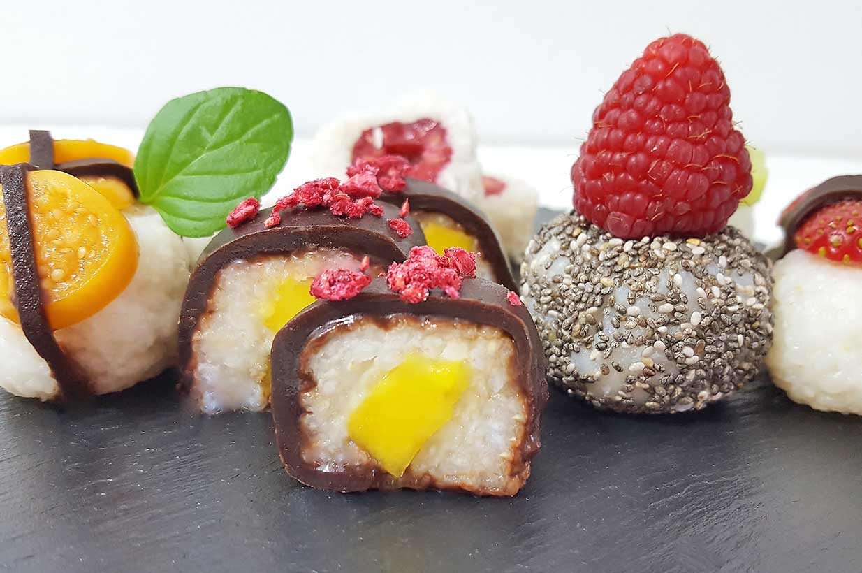 Veganer Sushi-Dessert mit Himbeere, Mango und Kokos auf Schieferplatte.