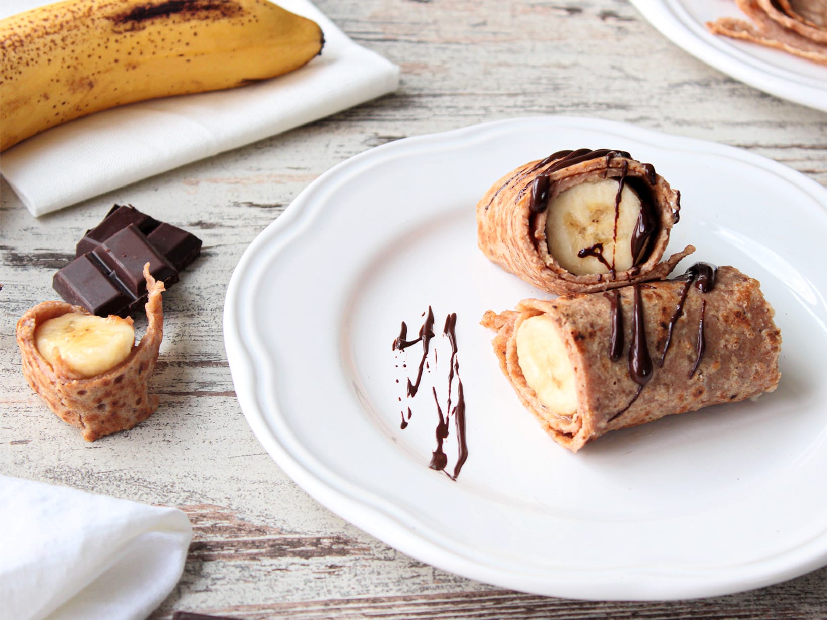 Immer eine Banane in einem Pfannkuchen einrollen und die geschmolzene Schokolade darüber geben.