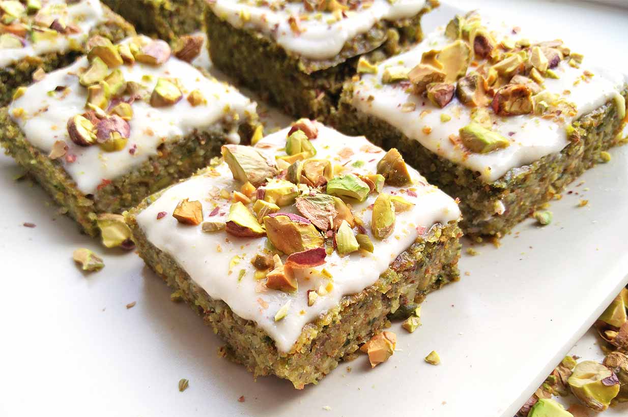 Zuletzt Pistazien hacken und als Dekoration auf den Kuchen daraufstreuen.