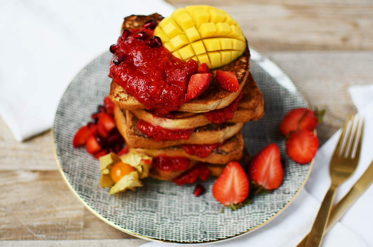Die Erdbeeren pürieren und als Sauce zum Toast essen oder in Scheiben schneiden und als Topping auf den Toast legen. Tipp: Wer möchte kann die Toasts stapeln, die Erdbeersauce dazwischen schichten und das Frühstück mit Mango, Physalis und Granatapfelkernen dekorieren.