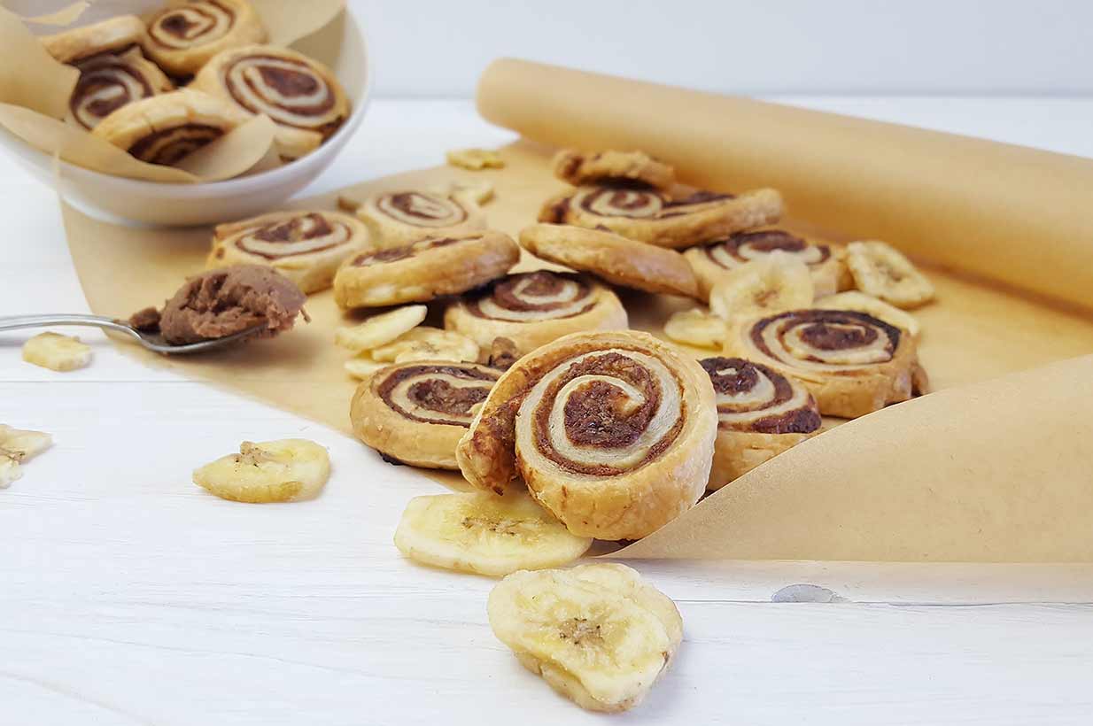 Dieses Rezept für ein ganzes Blech voller kleiner Schoko-Bananen-Schnecken kann mit nur 3 Zutaten gezaubert werden und eignet sich besonders, wenn man überreife Bananen zu Hause hat.
