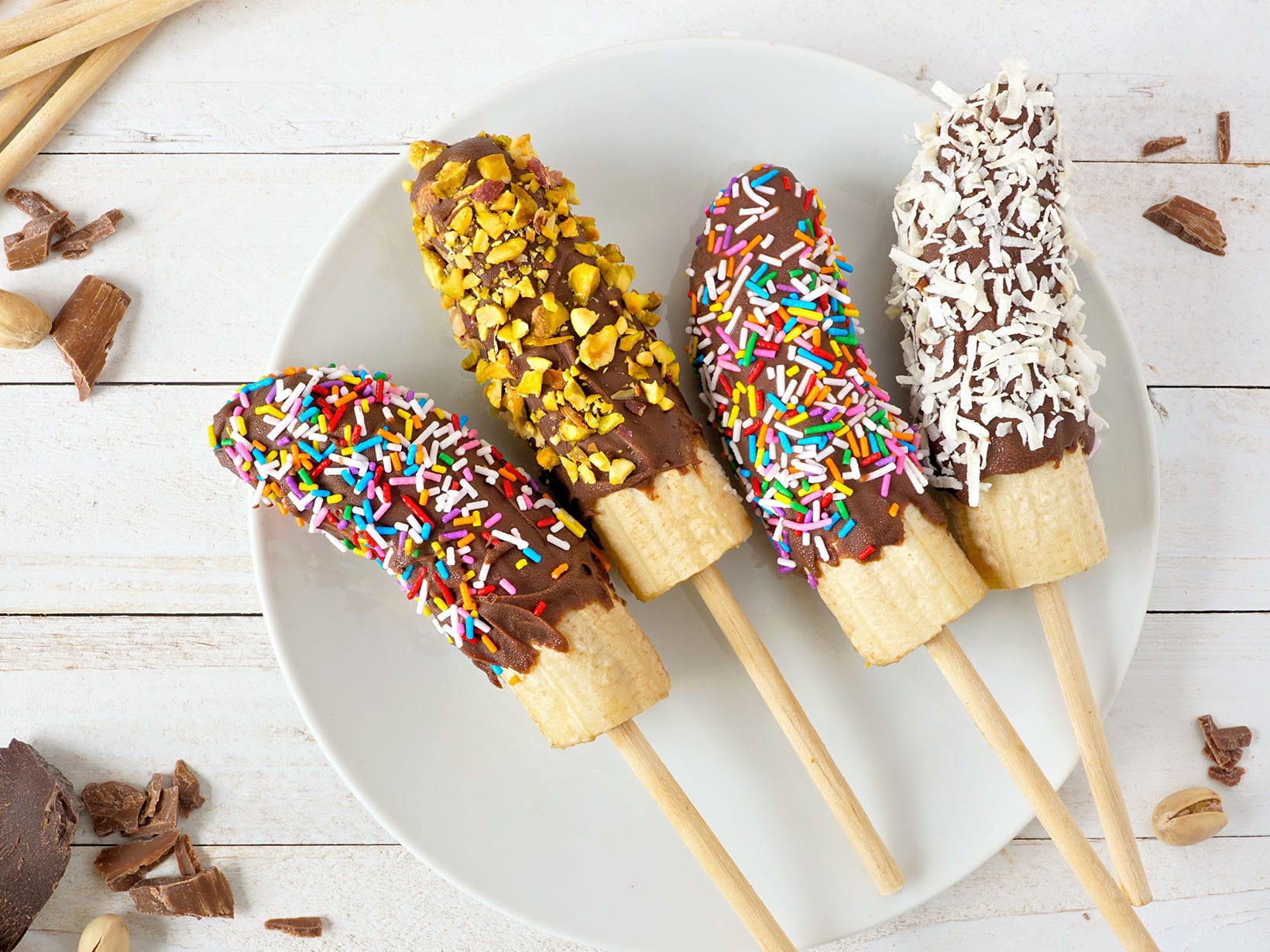 Schoko Bananen Spieße sind der vegane Hingucker auf jeder Party. Mit Toppings wie gehackten Nüssen und Kokosraspeln. Jetzt probieren!