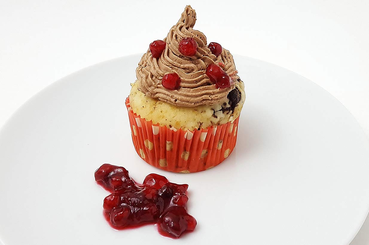 Die Schokocreme in einen Spritzsack geben und den Cupcake damit verschließen. Wer möchte kann noch ein paar Preiselbeeren zur Deko in die Creme drücken.