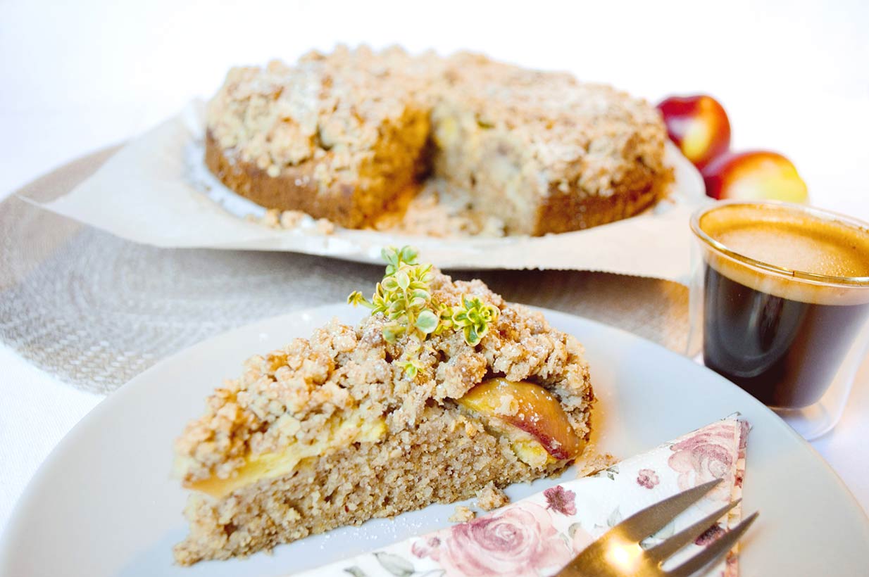Für den veganen und zuckerfreien Streuselkuchen mit Obst eignen sich beispielsweise süße Nektarinen. Jetzt probieren!