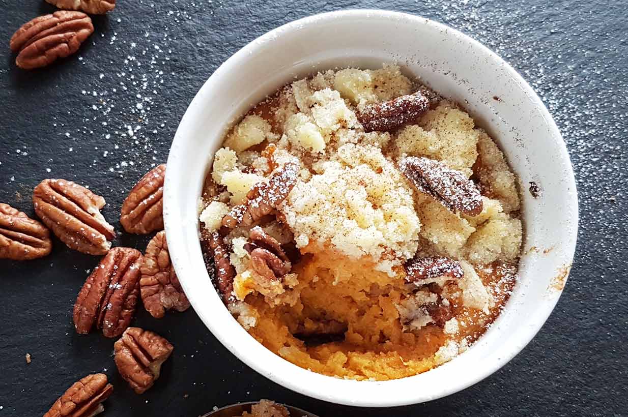 Jetzt die Süßkartoffelmasse in eine gefettete ofenfeste Form geben, mit Pekannüssen belegen und den Streusel bestreuen.