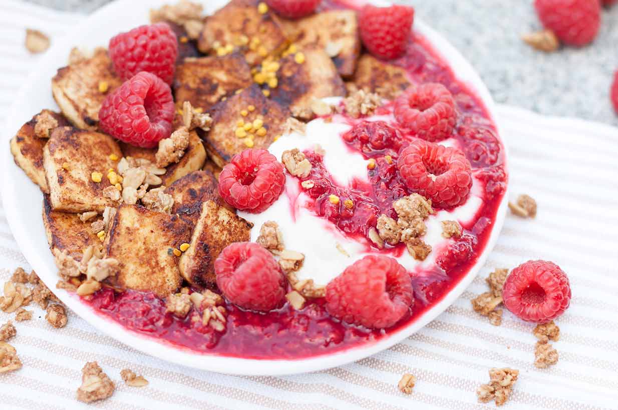 Dieser Tofu süß ist eine neue Interpretation des beliebten "Vegetarier-Fleisch" - mit frischen Himbeeren und selbstgemachtem Vanillejoghurt getoppt!