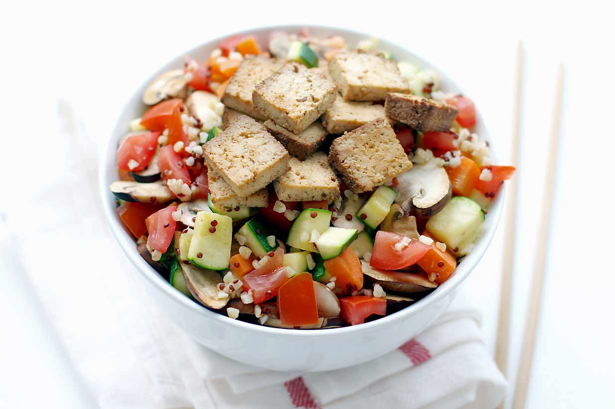 Nun das Gemüse, samt den Tomaten, die nicht gebraten wurden, mit dem Quinoa-Bulgur Mix in einer Schüssel vermengen und den Tofu hinzufügen.