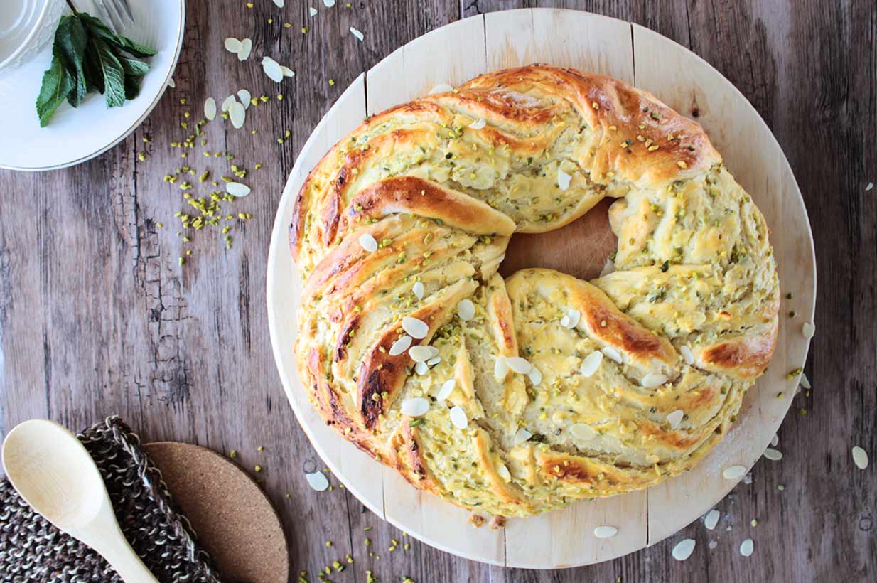 Dann den Kranz mit einem Eigelb und Pistazien bestreichen und ca. 40 Minuten backen.
