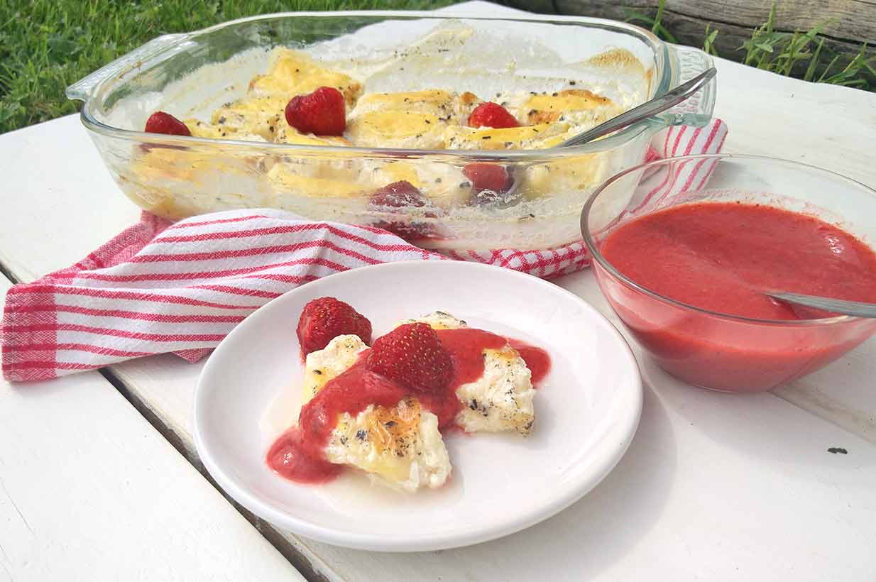 Währenddessen die Erdbeersoße vorbereiten: Dafür die Erdbeeren pürieren und mit Birkengold Bio-Xylit nach Belieben süßen. Man kann auch gefrorene Erdbeeren verwenden, die müssen dann vorher noch aufgetaut werden.